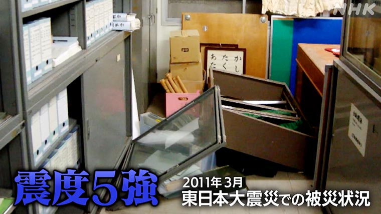 映像を再生すると、震度6強の揺れを体験することができます。テレビや棚が倒れたり、窓ガラスが割れたりします。